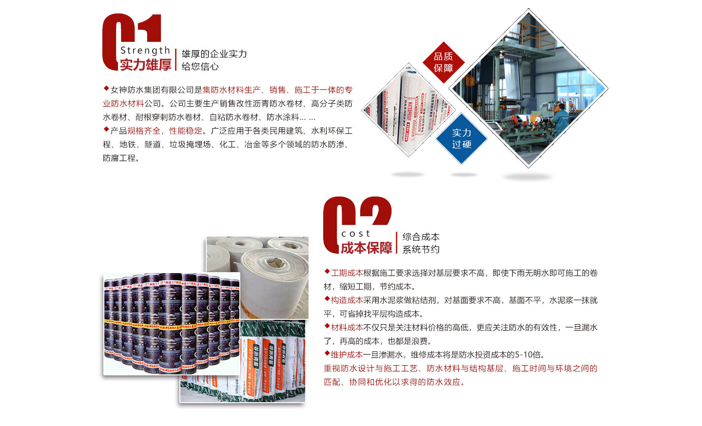 安徽女神建材科技集團(tuán)有限公司是集防水材料研發(fā)、生產(chǎn)、銷售、施工為一體的綜合性防水材料集團(tuán)公司。我公司旗下有多條大型一次成型生產(chǎn)線:SBS改性瀝青防水卷材,DTM聚酯復(fù)合高分子防水卷材,非瀝青基高分子防水卷材,PVC,TPO高分子防水卷材等生產(chǎn)線。我公司秉承“創(chuàng)新發(fā)展、實(shí)惠用戶”為宗旨,確保生產(chǎn)材料基礎(chǔ)上推出“共享生產(chǎn)廠家”,為開發(fā)商、建筑商節(jié)約成本為理念,新理念受到用戶企業(yè)集采時一致好評和認(rèn)可。在互聯(lián)網(wǎng)時代,我公司將以互聯(lián)網(wǎng)“共享”為發(fā)展理念,為開發(fā)商、建筑商、防水企業(yè)提供的產(chǎn)品,真正讓用戶企業(yè)達(dá)到巨大...